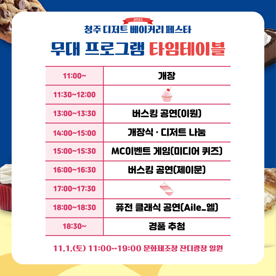 청주 디저트 베이커리 페스타는 단순 판매가 아니에요! 체험·공연·퀴즈가 가득한 풀코스 축제랍니다.