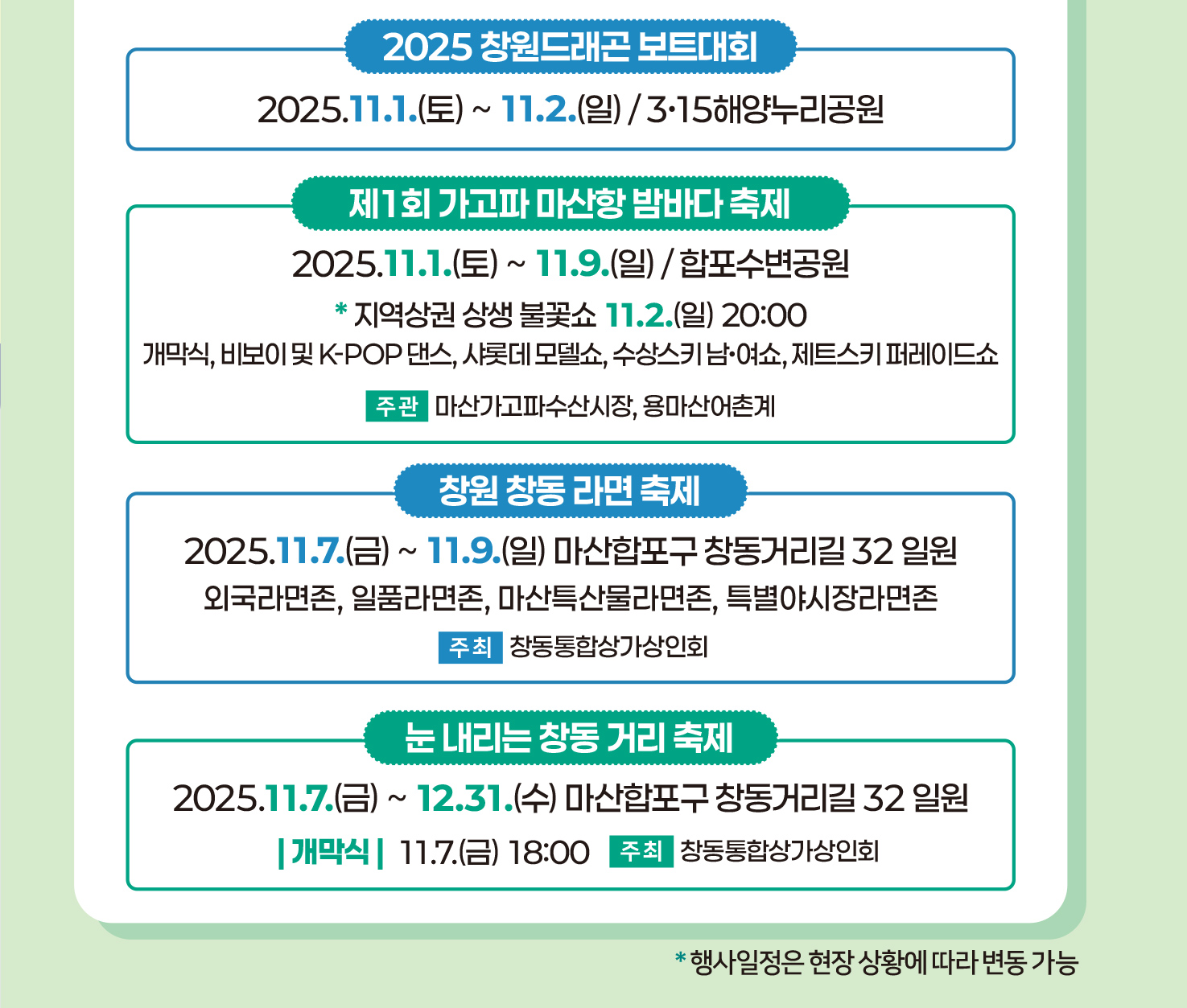 올해 축제는 2025년 11월 1일(토)부터 11월 9일(일)까지 9일간 진행됩니다. 장소는 두 곳으로 나뉘어 있어요: 3·15 해양누리공원과 합포수변공원 일원. 바다를 끼고 있어 산책로가 예쁘게 조성되어 있죠. 개막식은 11월 1일 저녁에 열리며, 폐막식은 11월 9일에 예정돼 있어요. 축제가 한창이니, 주말에 방문해 보세요!