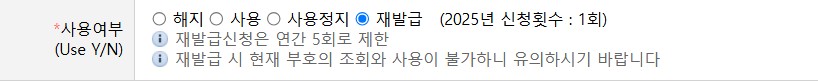 3. 발급신청에서 사용여부 → 재발급 클릭